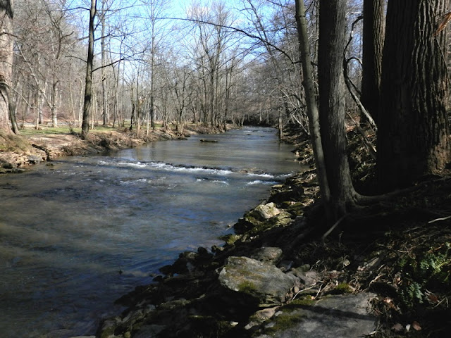 Once you get to the bottom of the hill, you'll end up alongside an unnamed creek. With all the recent wet weather at the time (rain and snow, plus melting snow from Jonas), this little creek was a bit cloudy and flooded. At this point, the trail also takes a turn to the northeast running parallel with the trail on top of the hill I had just explored.